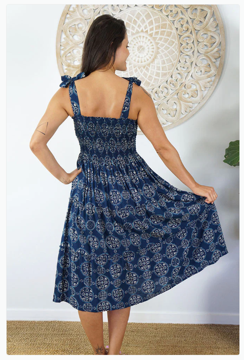 Our 3/4 Tie up smock dress features square neck, shirred bodice, tie up shoulders and a tiered skirt. Made from our soft cool rayon which is perfect for those hot days.