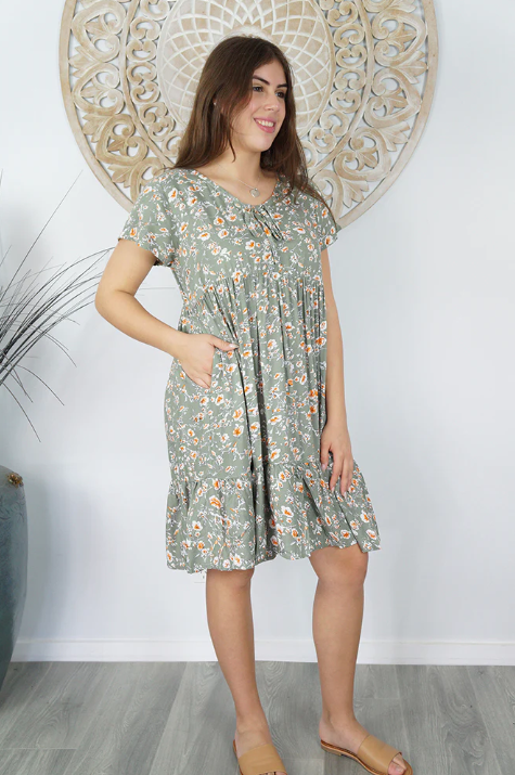 Features V neckline and capped sleeves, pockets along with a wide frilled hem.