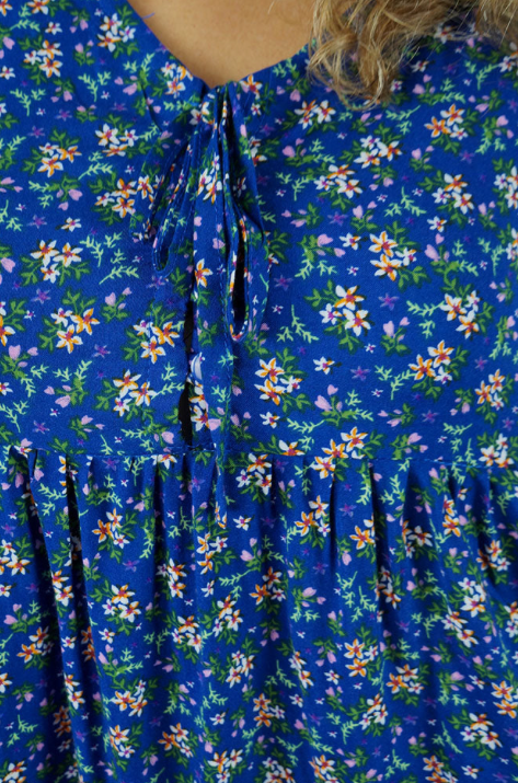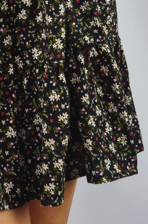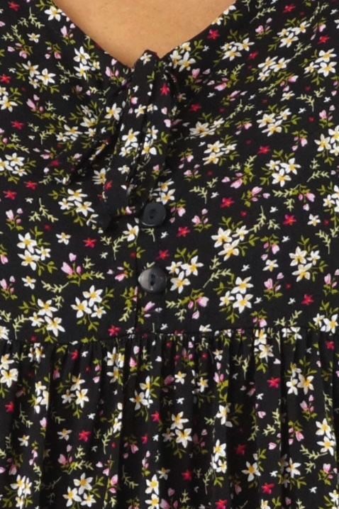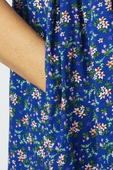 Features V neckline and capped sleeves, pockets along with a wide frilled hem.