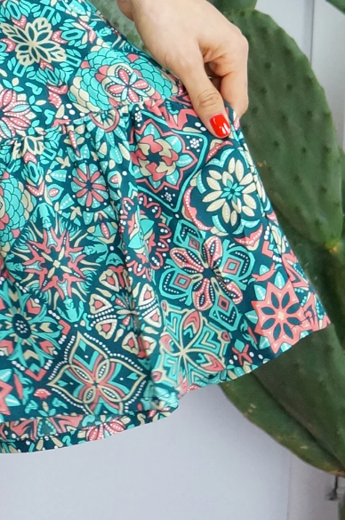 Features V neckline and capped sleeves, pockets along with a wide frilled hem.