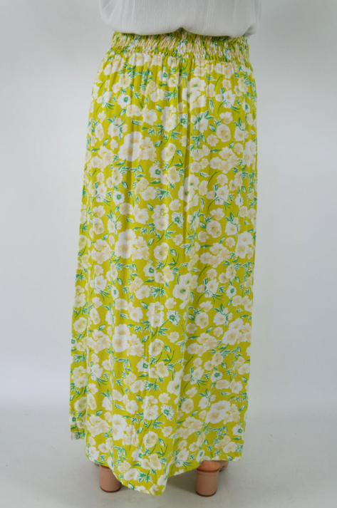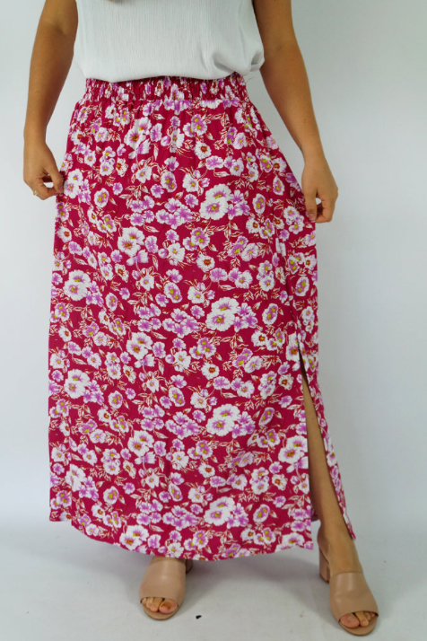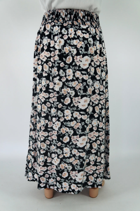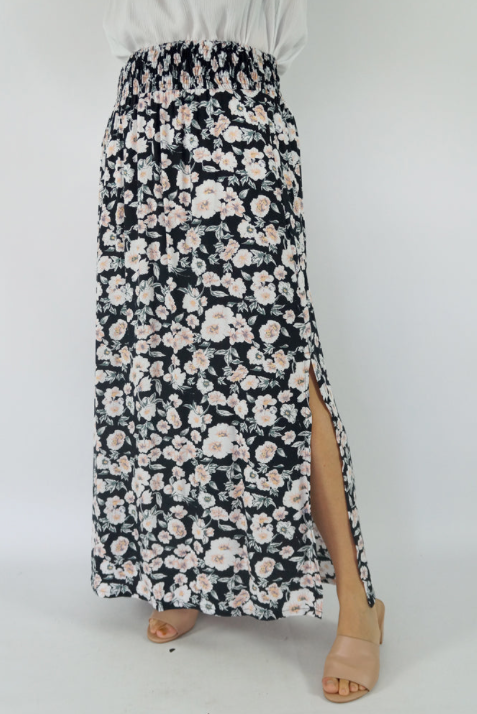 This rayon skirt features an elastic smocking waist, and splits either side. ONE SIZE TO FIT 6 to 18
