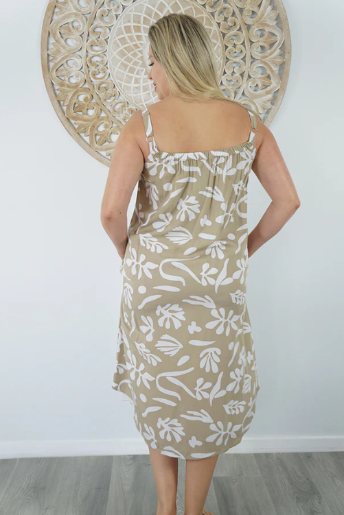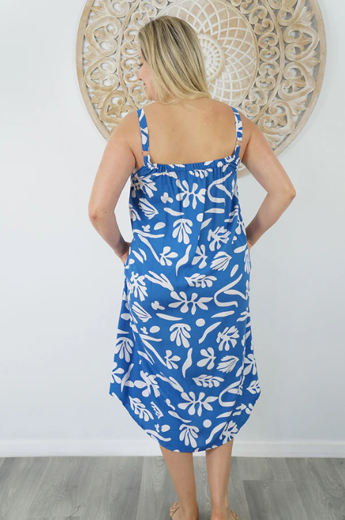 Easy fit mid length dress that falls away from the neckline. Comfortable elastic across the back and adjustable straps.