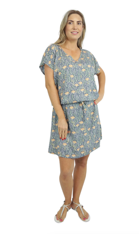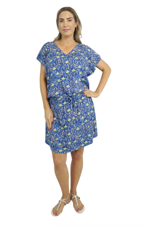 This is a capped sleeve dress that features a drawstring at the waist for an easy fit. Great as that beach cover up you’ve been looking for.