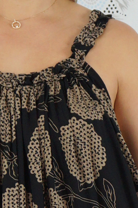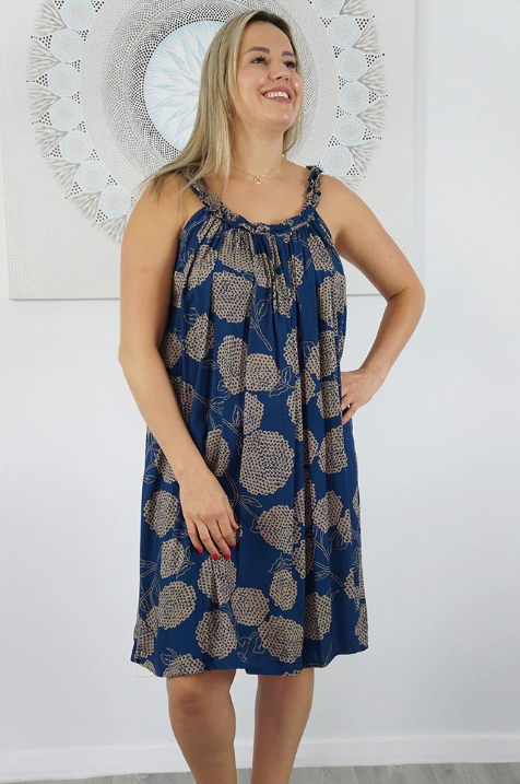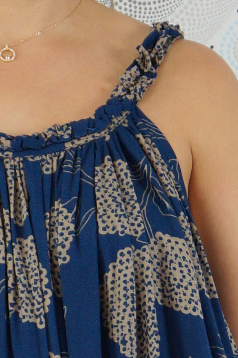 Made from a cool printed rayon, with a stylish frilled neckline.